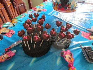 And another treat…Liza made cake pops. They are my absolute favorite. I had my first one at a bake sale at school and these were only my 2nd time having them. They did not disappoint. Liza put little white chocolate ears on them so they looked like Minnie Mouse. She’s a good mom. (If you are unfamiliar with cake pops, they area baked cake and icing mixed together and put in the form of a ball, then dipped in chocolate, white or milk.)