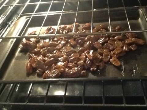 Here’s a picture of the pecans going in the oven. (I will let you know tomorrow how they tasted going down the hatch.