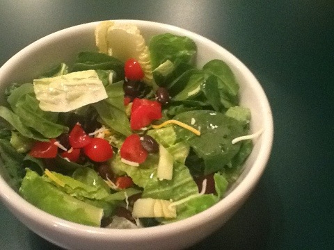 And I burnt the pork chops, so I had to do plan b on those, and made Market Day Naked Chicken Cordon Bleu. It’s actually not bad for a pre-made chicken, but it’s not what I had in mind. The savior to the meal was the salad which I chopped the tomato and cucumber really small (I love when restaurants do that) and added black beans and a pinch of cheddar cheese.
