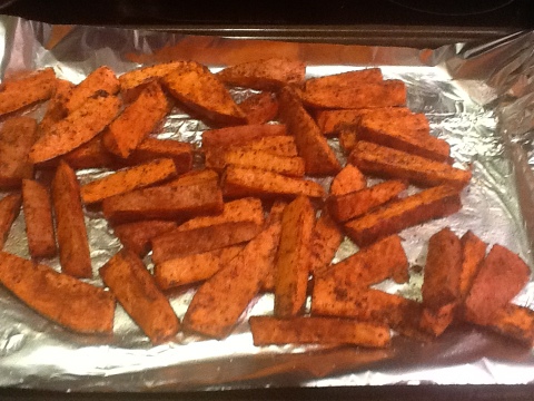 Tonight I made these Sweet Potato Fries. I used only 1 tbsp of olive oil instead of 2, and only half a teaspoon of salt instead of two teaspoons.