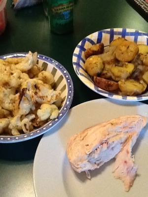 Then, in a foil packet on the grill he made Yukon Gold potatoes with olive oil, salt, pepper, and fresh rosemary. And lastly, my favorite, roasted cauliflower. Yummmmm.