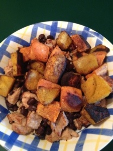 Then, I roasted acorn squash and sweet potato, using coconut oil, cumin, chili powder, salt, pepper, cinnamon, and red pepper flakes.