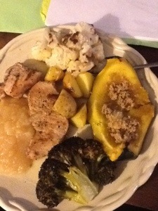 It was a pork chop, roasted broccoli, fingerling potatoes, and cauliflower. Also, acorn squash. I added cinnamon applesauce to the mix. And my mom makes this delicious sauce to put on the vegetables. (Mom, can you write the recipe in the comments.)