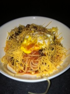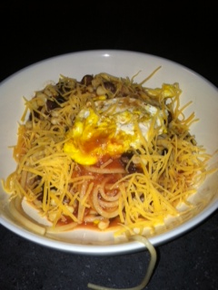 Instead, I asked Mr. FS if he could handle this recipe for Huevos Rancheros Spaghetti that i had found in Oprah magazine. He’s not really a recipe guy. Don’t get me wrong, he makes a mean chicken nugget or box of Kraft mac and cheese. But he was game and he started by the pasta while I went on my run, and I fried up the eggs when I got home. Huevos Rancheros is my favorite Mexican restaurant dish, and I thought this recipe sounded delicious. It was. This picture is gross. The meal was not.