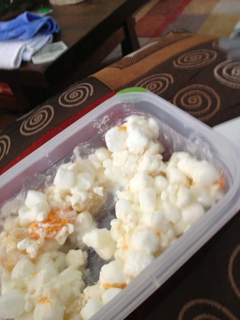 My other sister-in-law, Georgi’s marshmalow “salad.” It’s got marshmallows, cottage cheese, pineapples, mandarin oranges…yummmm…