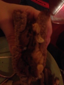 Fourth: I went on a date with my husband. We went to Columbus, the city we used to live in, that is about 45 minutes away from our house. It has much better restaurant choices than the small town we live in. We went to a place called the “Jury Room.” Dinner was AMAZING. I ordered a brisket and macaroni and cheese sandwich with spicy ketchup. The side dish was truffle fries with aioli. We were SOOO full by the time dinner was over, but it was all SOOOO good. Here is a picture of the sandwich…it was so dark in there, and it is a terrible picture, but I am still posting it.