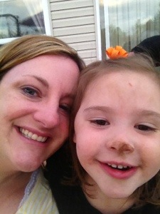 Here is a picture from the barbecue at my bff’s house. This is her daughter, Megan, and me. Her daughter was having the best time with the neighborhood kids, so we were cracking up at how dirty she is – because my friend, Liz, is the cleanest person I know.