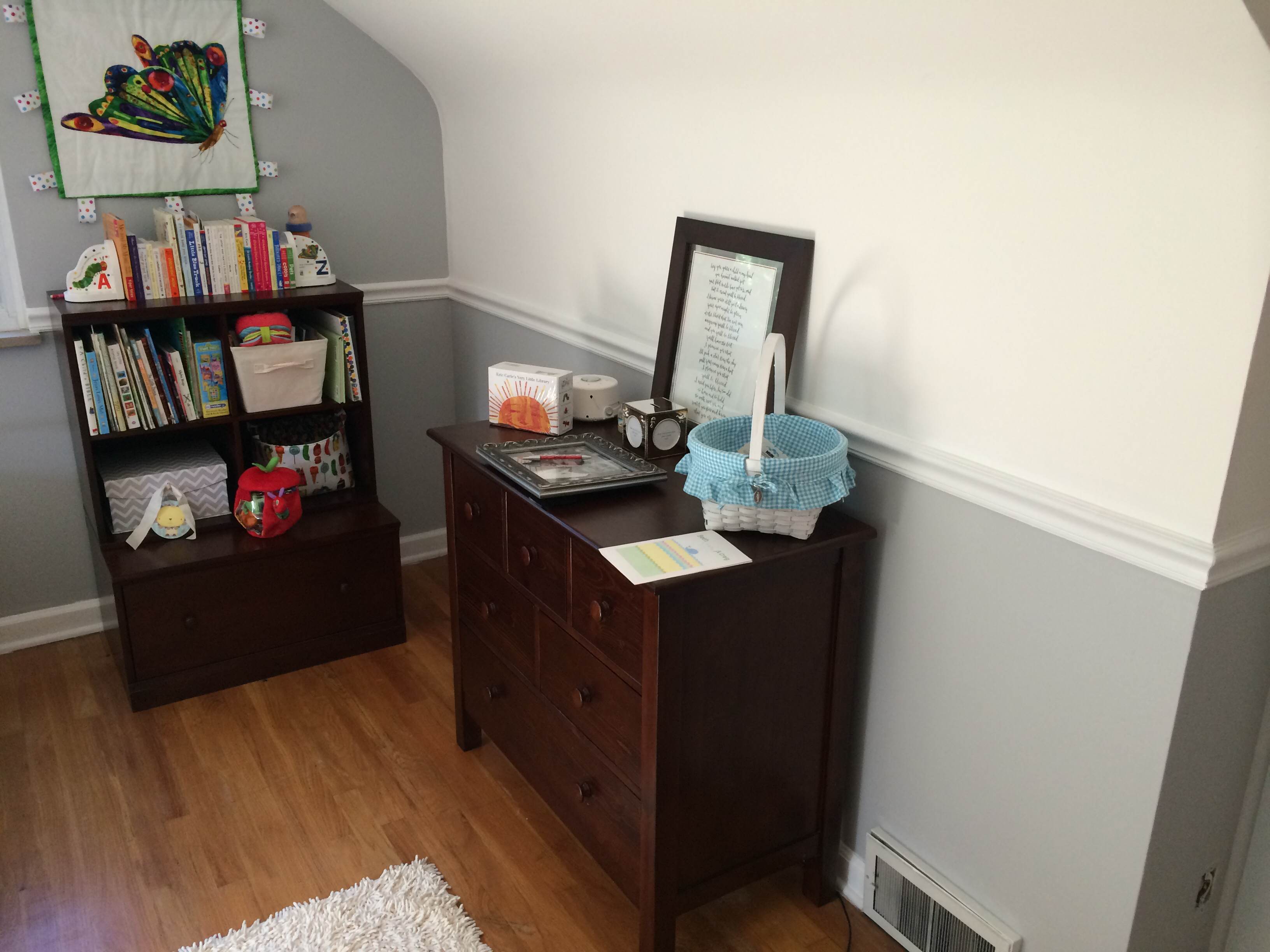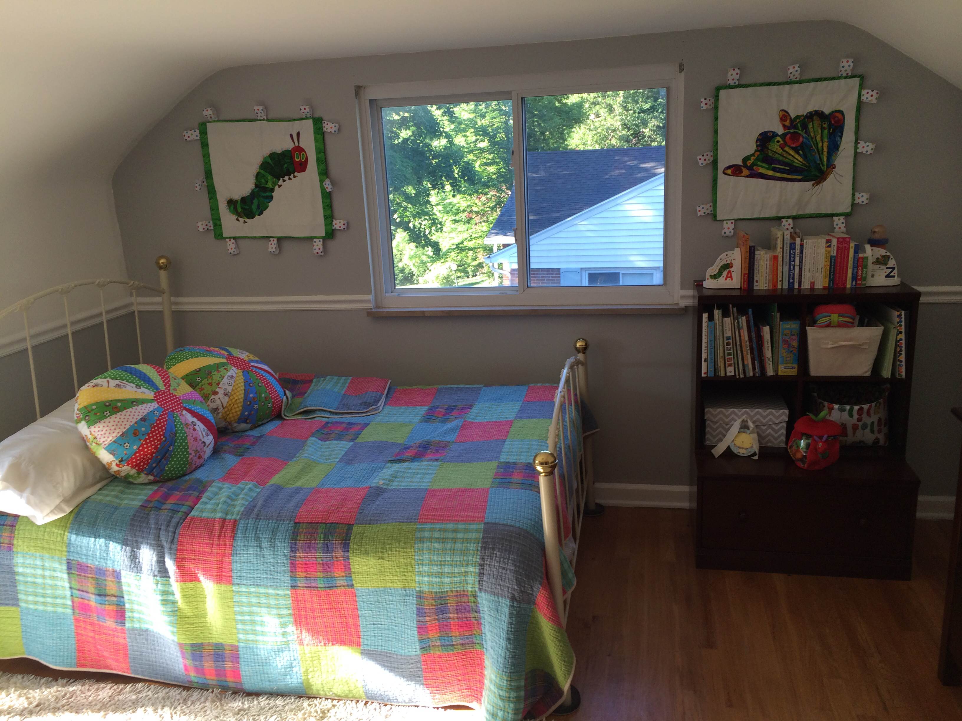 The room that we chose for the nursery was just kind of a blah room until we painted it and started cleaning it out, and now it is one of the most beautiful rooms in the house. It has three windows, a large closet, and beautiful views. The only thing left to do in there is hang the curtains after my mother-in-law does some alterations, put up the changing table by the front window, under the “LOVE” wall, and a book shelf in that dormer area as well. Oh, and put all of the new outlets in with the Very Hungry Caterpillar outlet covers and switch plate. But, I would say it is about 85% finished in these pictures.