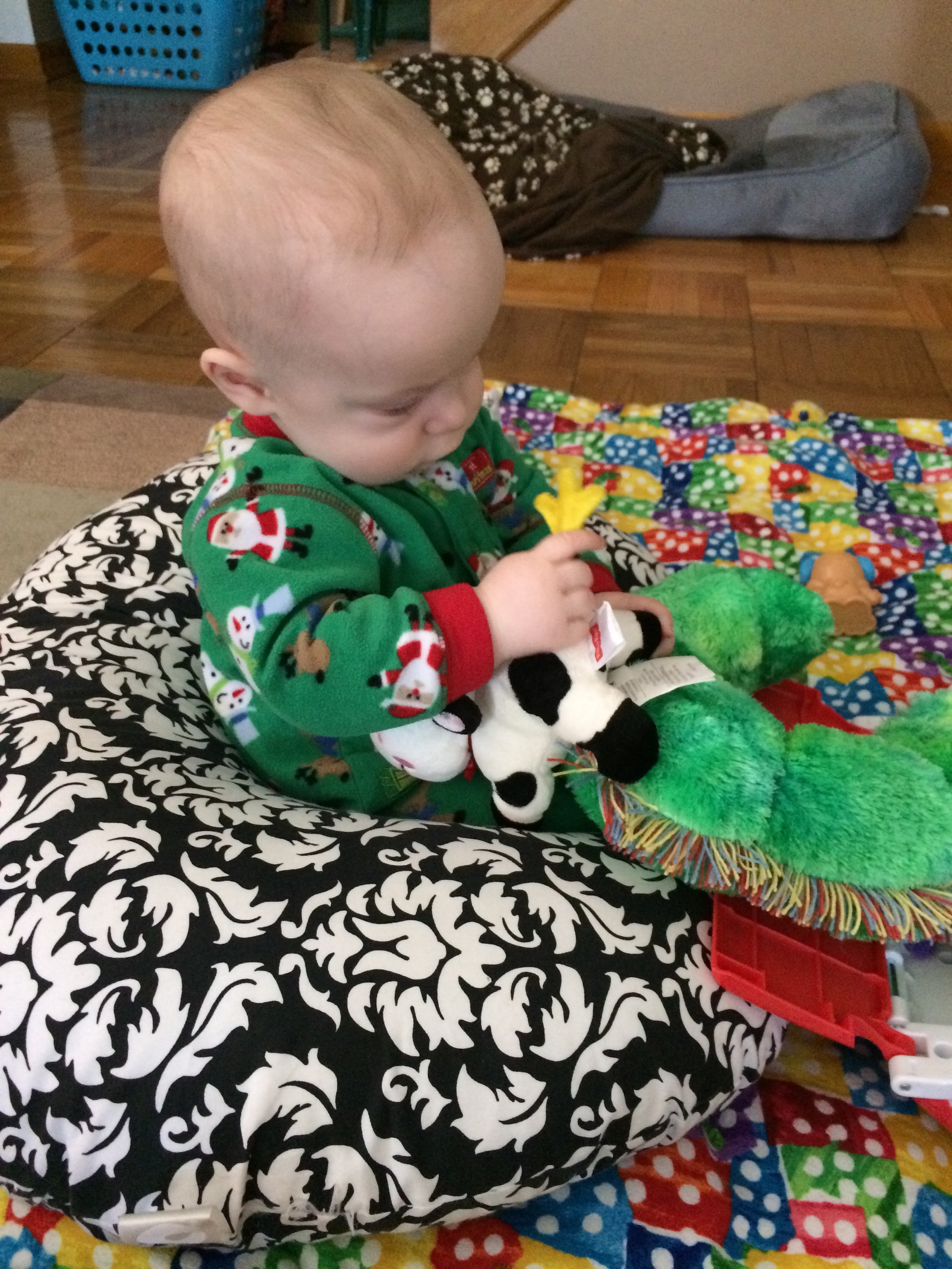 Henry has reached so many milestones lately. He rolls over both ways, he is really trying to crawl, he sits up pretty well, he got TWO teeth on the bottom, and he laughs and makes noises constantly.