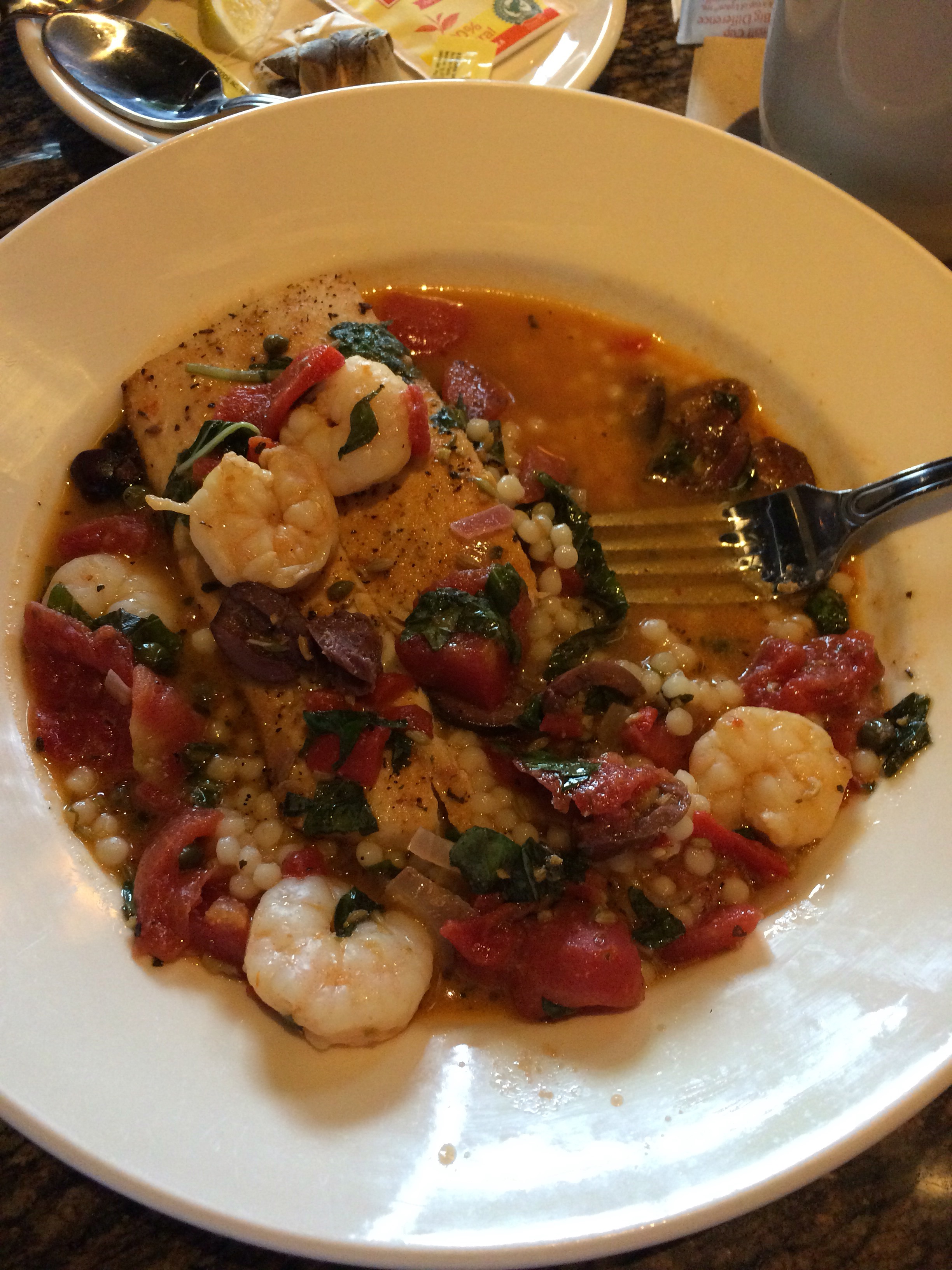 I had a few non-scale victories today. I was off work for an appointment and I had to go to a town about an hour away to get my fingerprints done to renew my teaching license this year. On my way back I was starving and had no idea what I was going to eat. When I am staring and I go into a restaurant, it is not a good situation. The restaurant I chose was a chain- BJ’s Brewhouse. I was delighted to see that they have a light menu with the calories listed. I got this delicious Mahi Mahi on Israeli couscous- it was called North Beach Mahi Mahi with shrimp.