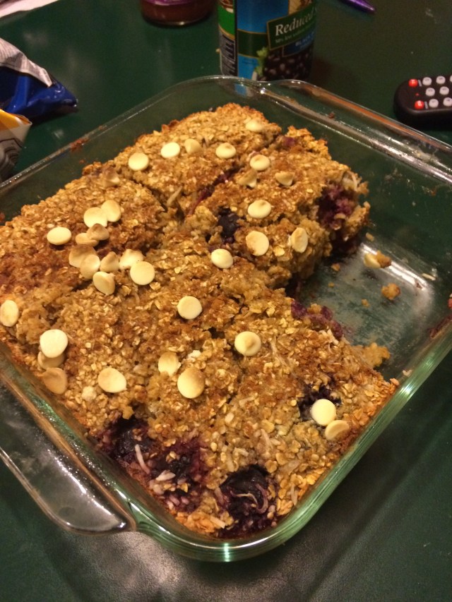 Now I have extra calories and fat that I can use to add a dab of almond butter. I melt the almond butter and drizzle it on and it’s delicious. (Other ingredients include milk, oats, coconut, 2 eggs, baking powder, cinnamon, white chocolate chips, frozen bananas and frozen sweet cherries.)