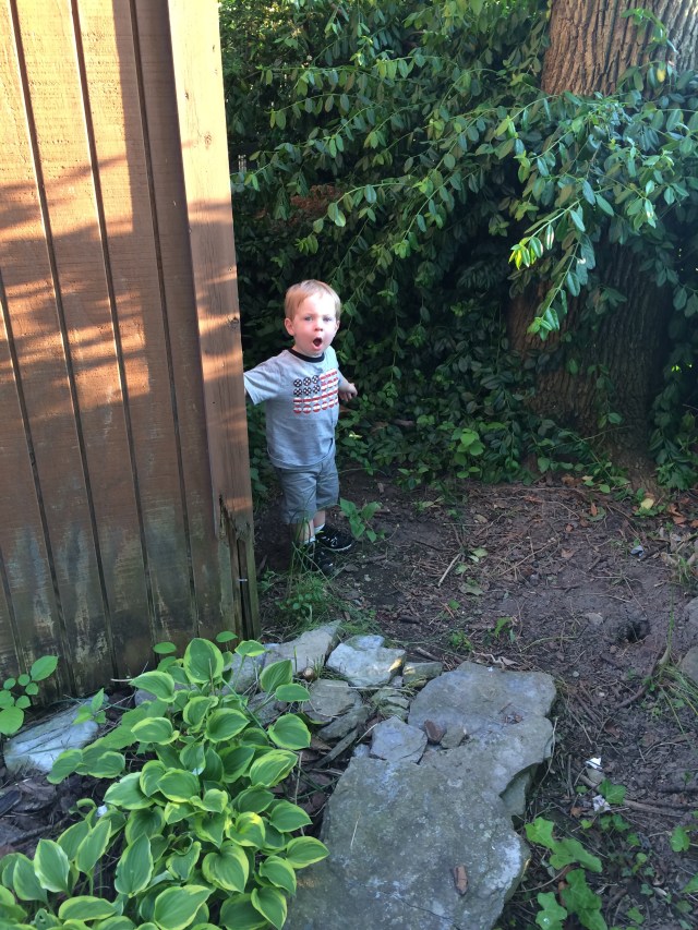 He was distraught because our dog went behind the shed and he couldn’t see her any more… Until she came back around the other side. That’s his “uh-oh” face.
