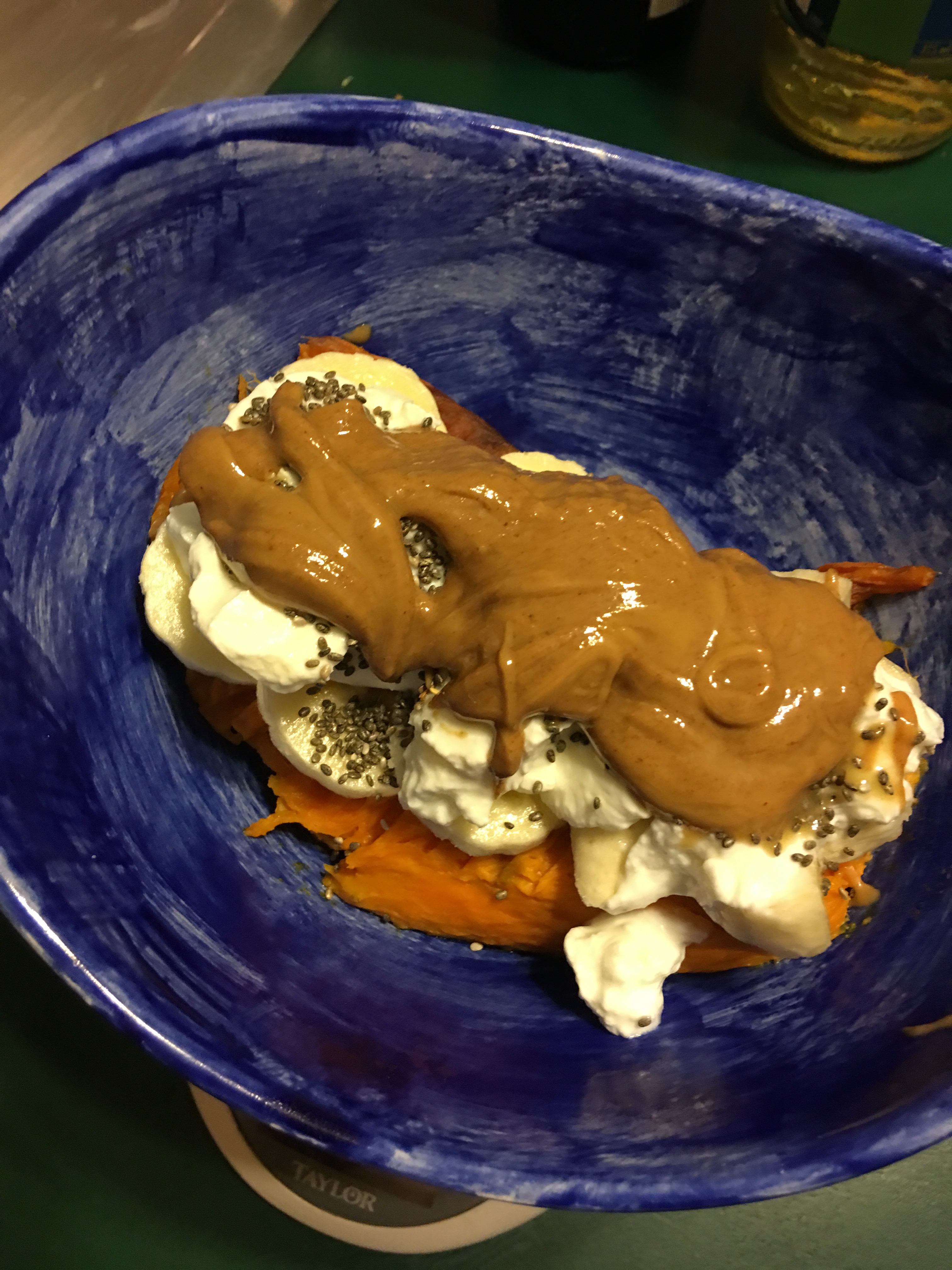 A baked sweet potato topped with half of a banana, Fage total, chia seeds and almond butter. (This picture makes it look like a ton of almond butter but it was 1.5 tbsp)