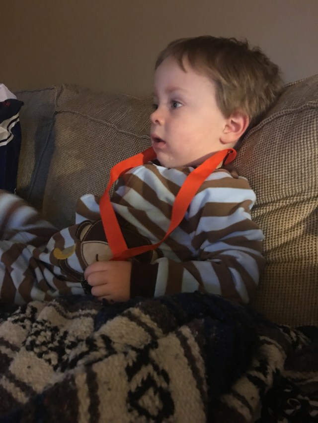 He loves wearing my medal from the 5K!