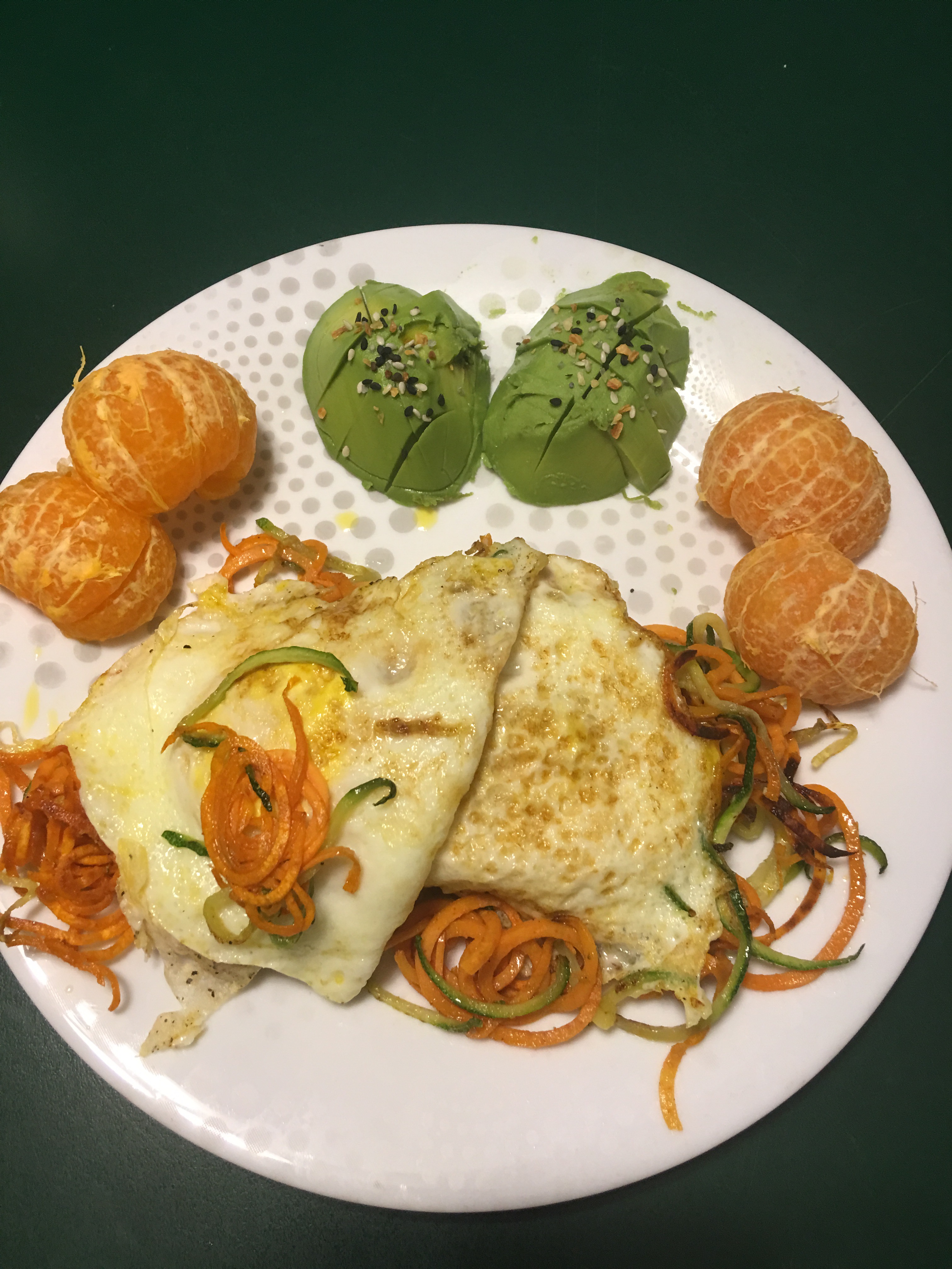 Here is my dinner; mashed sweet potatoes, Aidells chicken apple sausage and zoodles in ghee with TJ’s Everything but the bagel seasoning.