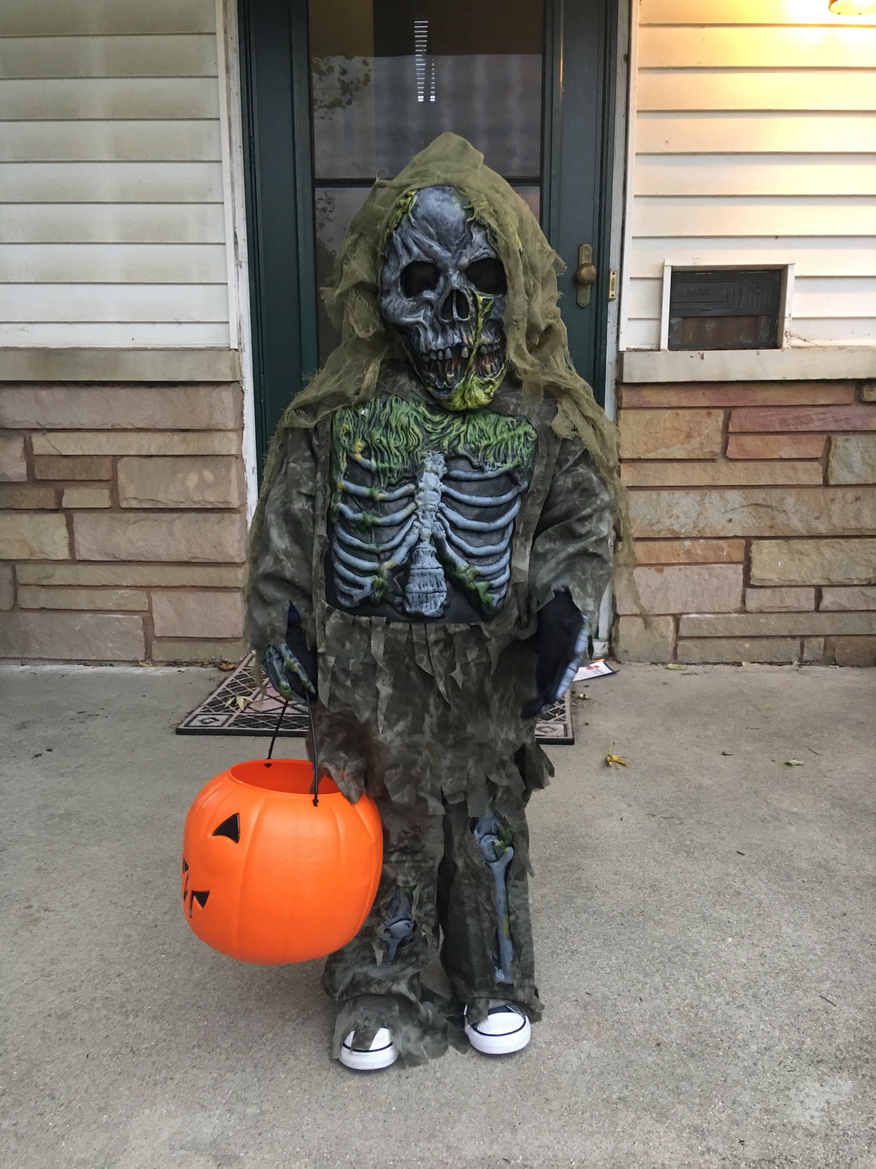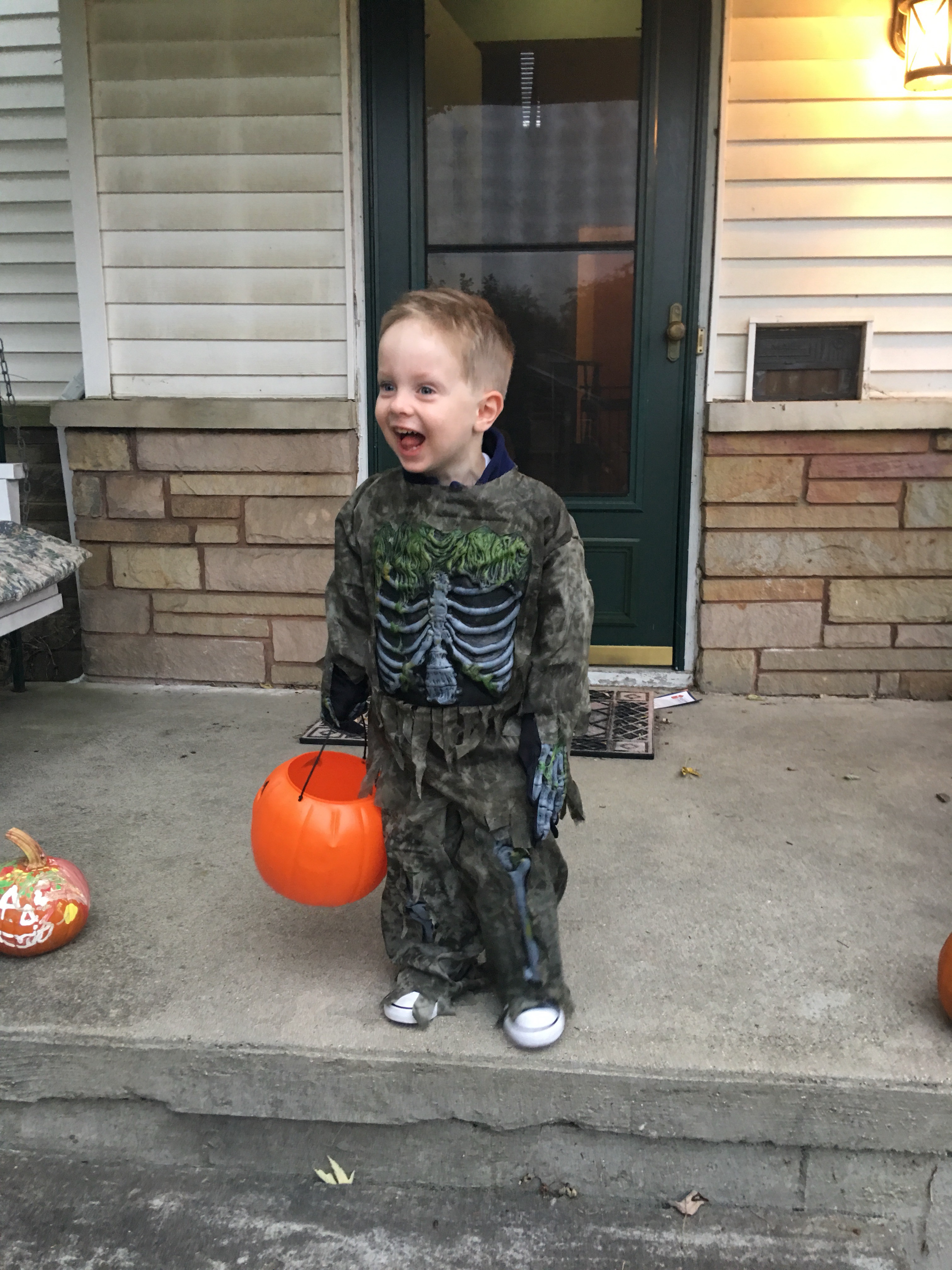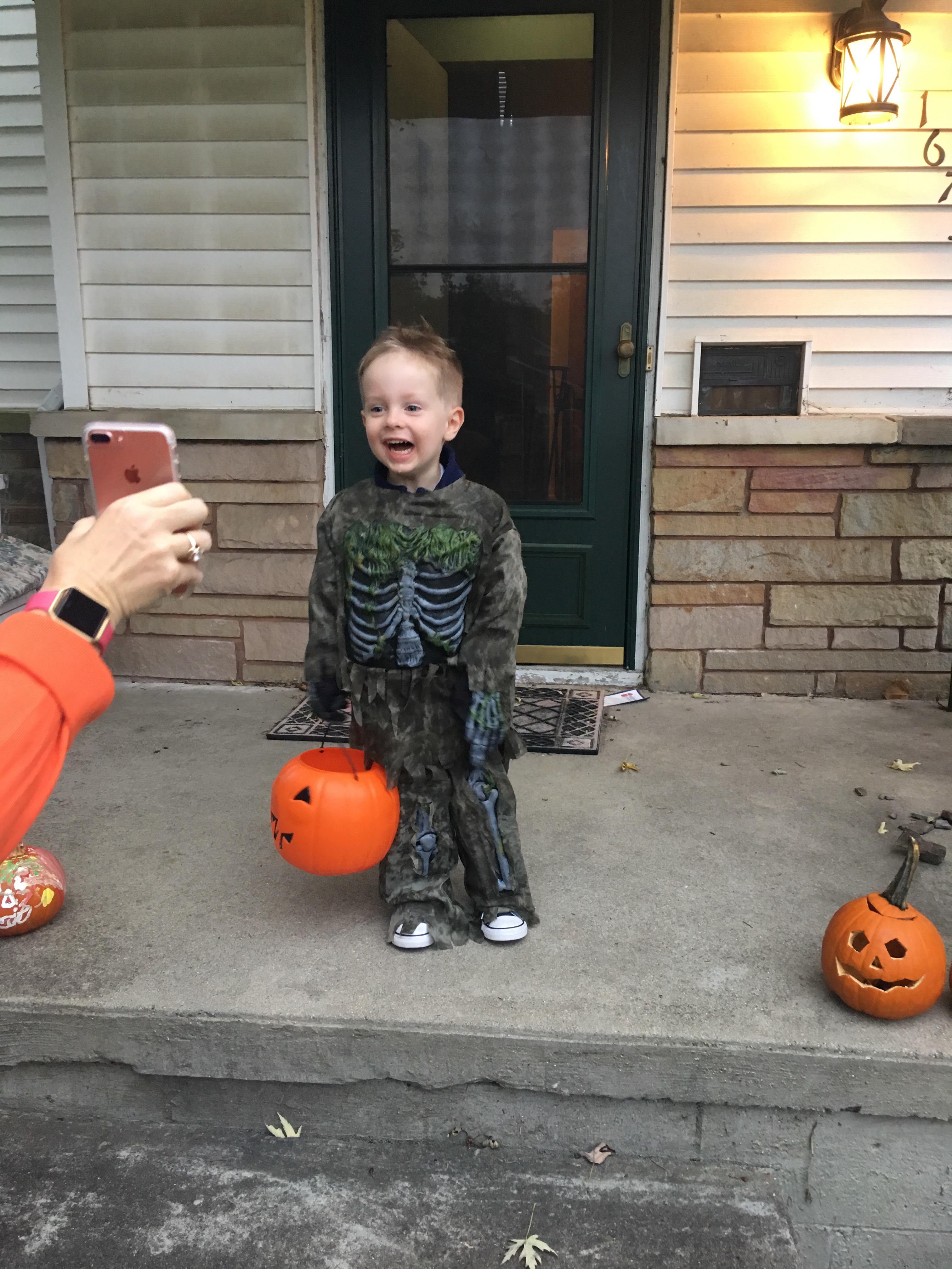 Last night my school had a “Fall Fest,” for the younger kids at our school. It was a bunch of games in our gym and the kids could win prizes at the games. Little kids love it and I was so impressed with my big kids who came to volunteer. It was a fun family night but I am exhausted. I have a cold and I’ve been so tired all week. I’ve also been eating like crap. But I am stopping that this weekend. I’ve been wavering on where to go from here. I did well on Whole 30, and I didn’t track. But once I started eating other food as well, I lose the ability to eat in moderation. So, I either eat all the foods and track or I eat Whole30 and don’t track. For me right now that’s the reality. I am just starting the book Food Freedom by Melissa Hartwig, creator of the Whole30, and I’m going to see how that helps. I plan on doing a Whole30 in January but I need a plan over the holidays. One thing I am spottily doing is working out in the morning. I’m going to keep trying to do that and see how it goes. I love the feeling all day when I do it, and I hate the feeling all day when I don’t. So, it’s a work in progress. In other news, we had a really fun Halloween. Henry was a zombie like he wanted to be for months. I’ll admit I was not excited about this. I wanted my cute little boy to have a cute little costume. But, it turned out he was cute enough to make even a zombie costume cute.