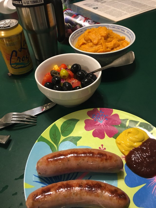 Aidell’s chicken sausage, pepper salad (it’s almost gone! Ha ha), and Trader Joe’s mashed sweet potatoes. I didn’t eat the whole bowl, I just didn’t want them on my plate.
