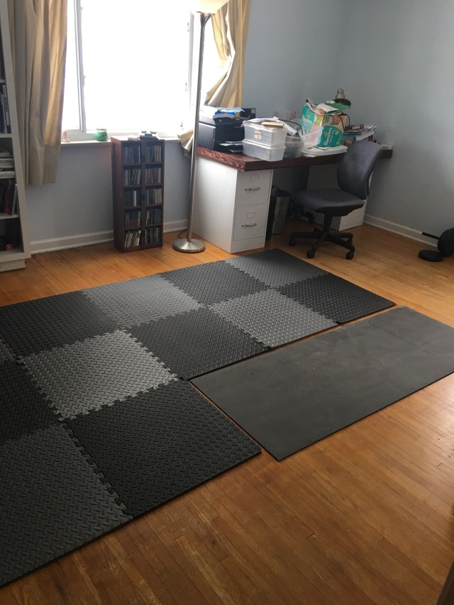 It is starting to feel like a place I want to hang out and exercise. I need to get somethings to hang on the walls, but so far I like it. Oh, I also need to get more floor tiles because i am 3 short as you can see in that first picture.