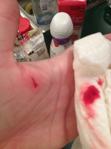 It was an event I could not re-create even if I tried. I opened a cabinet, something fell out, and it hit a wine glass that was on the counter. The wine glass shattered and went flying at the same time, and when I put my hand up to block my face, the glass had bounced up and hit my hand. I started bleeding right away and a LOT, and it looked like a murder scene.